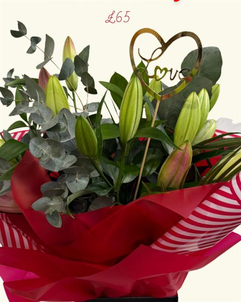 A romantic Valentine’s bouquet of elegant lilies, blooming with soft petals and a graceful fragrance. Timeless and refined, it’s a beautiful arrangement for your loved ones.