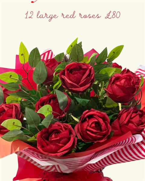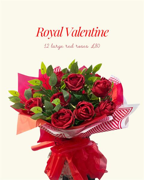 An extravagant Valentine’s bouquet of 12 luxurious red roses, expertly arranged to make a grand statement of love. Rich in color and overflowing with romance, this stunning bouquet is designed to impress.